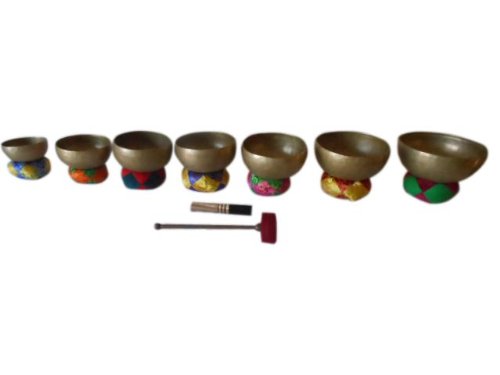 Tibetan Chakra Set Handmade from Nepal - New -7 sizes Sizes 4"-10" Old Style Healing Chakra Bowl Set You're looking at the Finest Handmade Chakra Set Tibetan Singing Bowls available! And the Best Price too! 2 different Mallets O-Ring (included) Rings are sold separately SEVEN BOWL SET FOR THE SEVEN CHAKRAS 4"-10" 4"- 5"- 5.5"- 6.5"- 7"- 8"- 10" These bowls are new, handmade in Nepal, of a 7 metal alloy by skillfull metal smiths. Expertly designed for quality sound, rhythm, and vibration, they are excellent for sound meditation, body relaxation, healing, therapy, Chakra tuning and clearing, head massage (larger bowls) and third eye opening. Each bowl has its own sound and feeling. The smaller bowls will be about 3-4 mm thick while the larger sizes may be as thick as 5-6mm. Each bowl is tuned to a different note on the musical scale, hence, a different Chakra. A complete set weighs about 13-15 pounds Using the mallet, strike the inside or outside of the bowl gently three times. Rub either the rim of the bowl in circular motion until the desired vibration is created. Remove mallet for bowl resonance and absorb the energy Cleaning Instructions: Use distilled water with about a 10% solution of bio-degradable detergent or water alone. Apply with a soft cloth, allow to dry, or blow dry. The bowls in our Old Style Healing Chakra Set are handmade in Nepal and the weights and sizes are therefore approximate rather than standardized. They are made of 7 different metals connected to 7 planets of our solar system. Each bowl is tuned to one note of the musical scale (and one of the Chakras) so that the set of seven bowls will include 7 notes, one for each chakra.