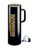 | ✚✚✚ Enerpac RAC-504 Single Acting Aluminum Cylinder 50 Ton Capacity and 3.94 Inch Stroke Enerpac single acting aluminum cylinders are lightweight by design to provide maximum portability. The composite bearings prevent metal to metal contact, increasing cylinder life and resistance to side loads of up to 10%. A hard coat finish on all surfaces resists damage and extends cylinder life, and handles are included on all aluminum cylinder models. Also featured is a steel base plate and saddle for protection against load induced damage. An integral stop ring prevents plunger over travel and is capable of withstanding the full cylinder capacity. A high strength return spring for rapid cylinder retraction is also included.