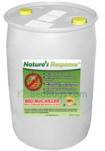 55 gal Bed Bug Killer FormulaEven better, you won't be exposing your family to dangerous toxins. The active ingredient in Nature's ResponseTM Bed Bug Killer is a natural pesticide that has been safely used for years to kill and prevent infestation. Bed bugs can't develop a resistance to it. Chemical treatments can't say that. Nature's ResponseTM Bed Bug Killer is safe for use around children and pets, so you don't have to choose between effectiveness and safety. Simply follow the instructions; you can get professional results without the expense of hiring an exterminator. Use a hand sprayer or fogger with the one-gallon economy size for easy application. Nature's ResponseTM Bed Bug Killer lasts for 30 days. First developed for the U.S. Military and thoroughly tested by Iowa State University, Rutgers University and the Insect Control and Research (ICR) laboratory in Baltimore, Md., Nature's ResponseTM Bed Bug Killer has been proven to kill bed bugs within one minute of contact, as well bed bug eggs and nymphs.