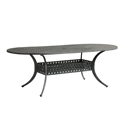 Amalfi/Maison Oval Dining Table - 84 inch Black- Ballard Designs?Coordinates with our Amalfi Dining Chairs & Seating. Assembly required. The romantic quatrefoil design of our timeless Outdoor Oval Rectangular Dining Table was inspired by a Mediterranean window grill and adds geometric flair to outdoor living spaces. Zinc-finish frame is crafted of aluminum, making it exceptionally strong and resistant chipping and rust.Amalfi Outdoor Dining Table features: . .